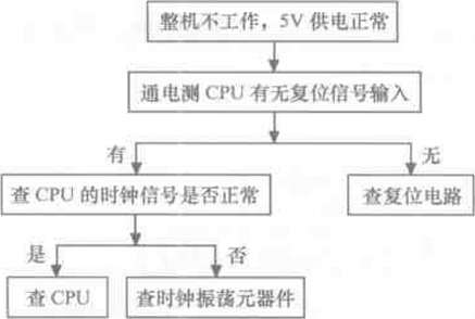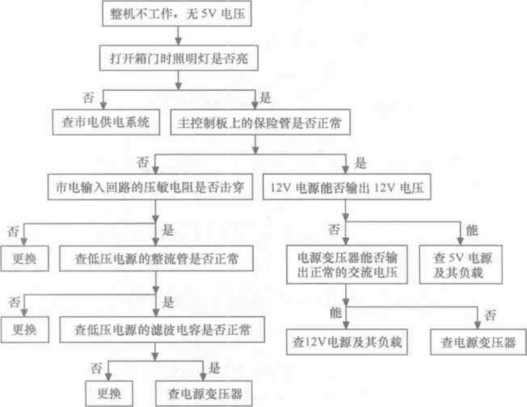 整機(jī)不工作是指插好電源線后壓縮機(jī)不運(yùn)轉(zhuǎn),顯示板上的指示燈或顯示屏也不亮,該故 障主要是由于市電供電系統(tǒng)或主控制板異常所致。該故障根據(jù)有無5V電壓又有所不同,沒 有5V電壓說明市電輸入系統(tǒng)、主控制板上的低壓電源電路異常:若5V供電正常,說明CPU 電路異常。整機(jī)不工作.5V電壓的故障檢修流程如圖8-9所示:整機(jī)不工作,有5V電壓 的故障檢修流程如圖8-10所示。